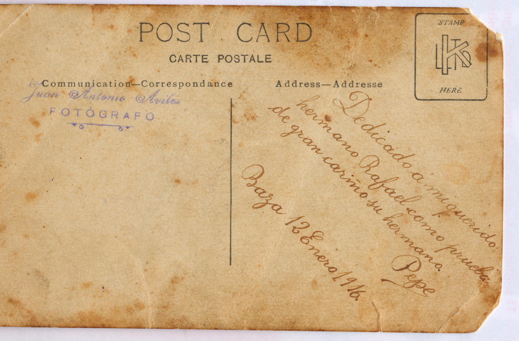 On the back of the photo, it says “Dedicated to my beloved brother Rafael as evidence of the great love of his brother Pepe. Baza [Spain], 12 January 1916.