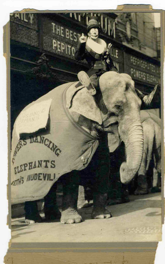 After discovering this photograph of Pepito the Spanish Clown atop a sweet-countenanced pachyderm, I became fascinated with Power’s Dancing Elephants. Power’s Elephants were four amazing trained elephants who performed at the Hippodrome from 1905 to 1923, and also toured in vaudeville and circuses. In 1926 they left America and toured throughout Europe for eleven years, returning to the States in 1937. In 1944, their owner, Mrs. Jeanne Power, sadly relinquished the elephants, selling them to a circus. The original four Power’s Elephants’ names were Lena, Jennie, Ada and Lou. After Ada and Lou passed away due to pneumonia, they were replaced by Roxie. Later, little Julia was born.