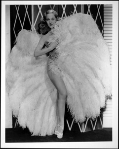Sally Rand and her famous fan dance. She toyed with the indecency laws of the 1930s by appearing to dance in the nude behind feather plumes. According to Joanne Perez, Sally Rand was wearing an invisible sheer leotard, so was technically “clothed.”