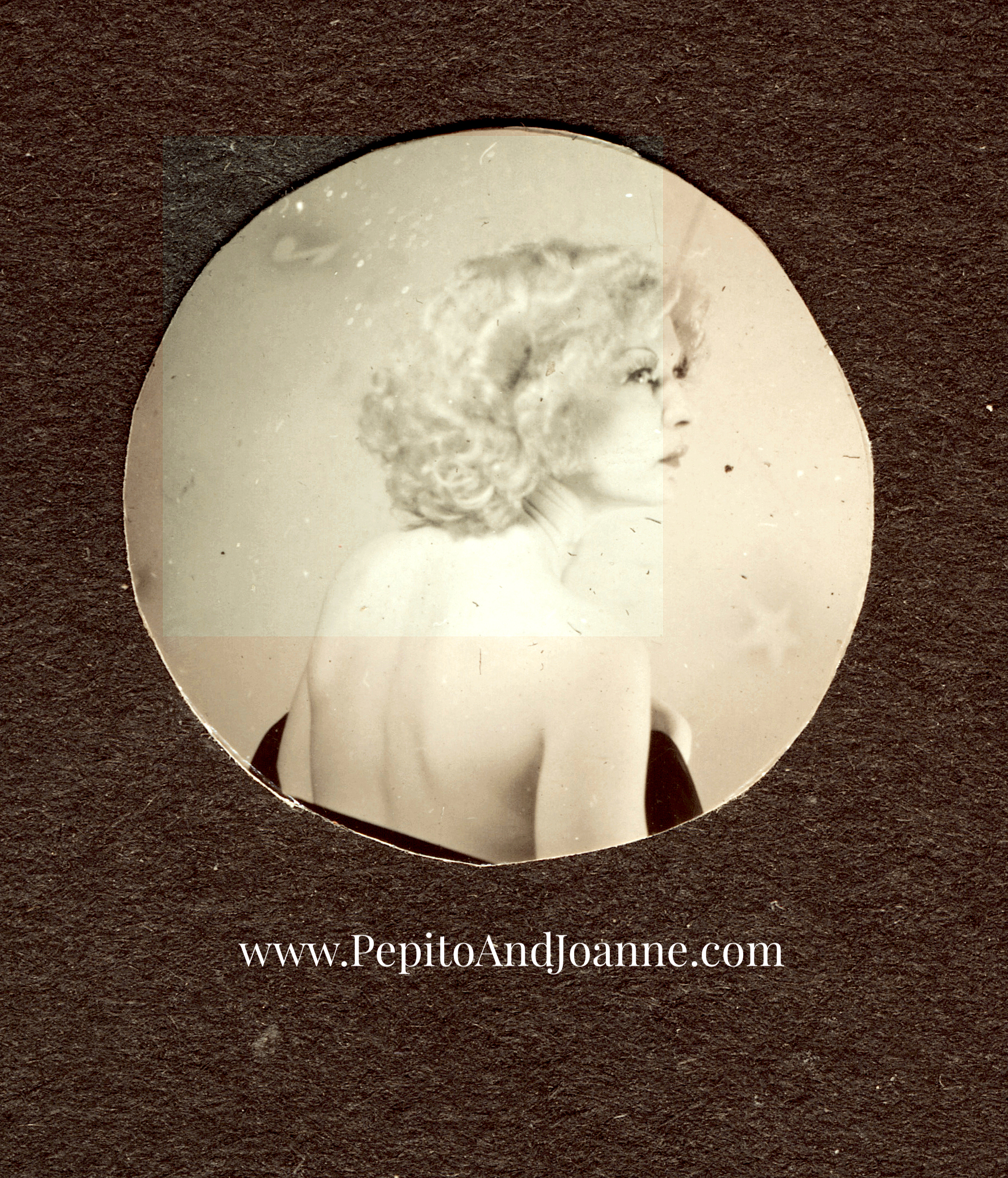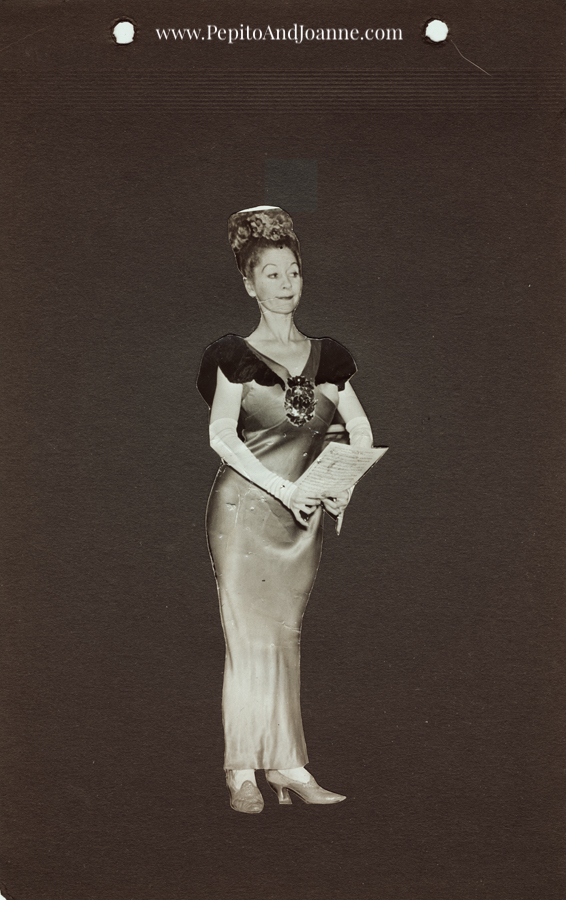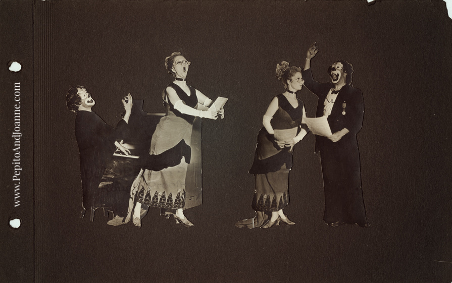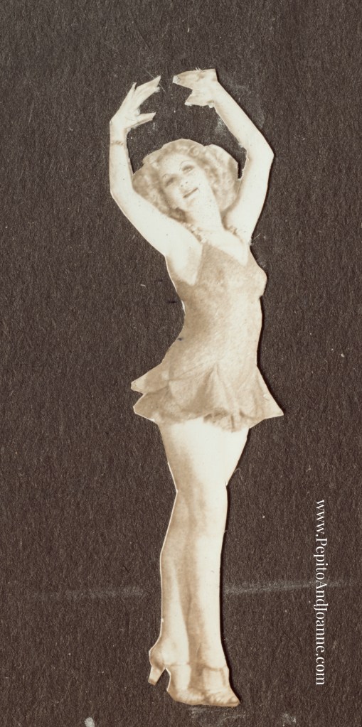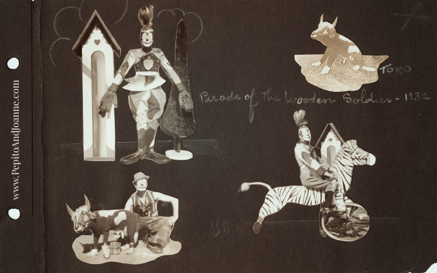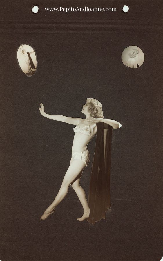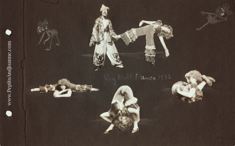 Many decades ago, Joanne Perez created the photo collages in her Little Black Vaudeville Scrapbook from assorted small candid photographs, and tiny “proof” photos from sessions with studio photographers. I can imagine her relaxing with Pepito in their hotel room after a show in Peoria or Cucamonga, expertly trimming some of the pictures, carefully brushing the reverse sides of with smelly rubber cement to glue them, and doodling with her white pencil on the black pages. Her work with those tiny scissors from her sewing kit gave the scrapbook an adorably quaint “paper doll” mood.