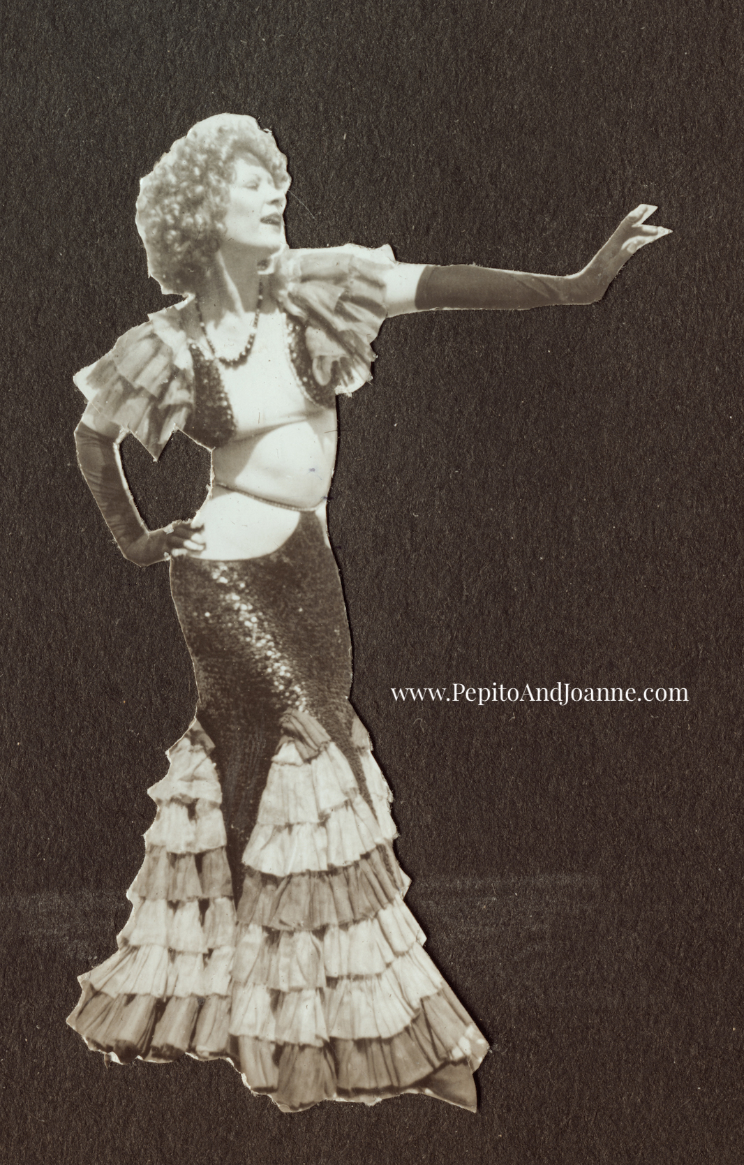 Pepito, who like Joanne was looking for new inspiration, cleverly invented his own “travesty act” (comic impersonation) of Sally Rand. Both Rand and the Fair management loved it. Pepito’s job description was expanded to include entertaining the daytime crowds with “his version” of Sally Rand’s iconic fan dance. Pepito’s “parody dance” was performed with large feathered fans, clown makeup, hilarious tights covered in shaggy “leg hair” made of black yarn, his naked torso — and the finishing touch, a stogie cigar clenched between his teeth.