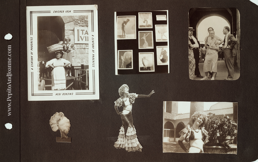 Joanne probably was influenced to make herself some more-revealing costumes after seeing the financially successful and famous erotic dancer Sally Rand, who was also a performer at the 1934 Chicago World’s Fair. Sally Rand, still famous today, was credited with “Saving the Chicago World’s Fair” by becoming its scandalous main attraction, with her famously provocative and sometimes nude “fan dance.” Scrapbook page courtesy of Marivi Escobar Santo Tomas.
