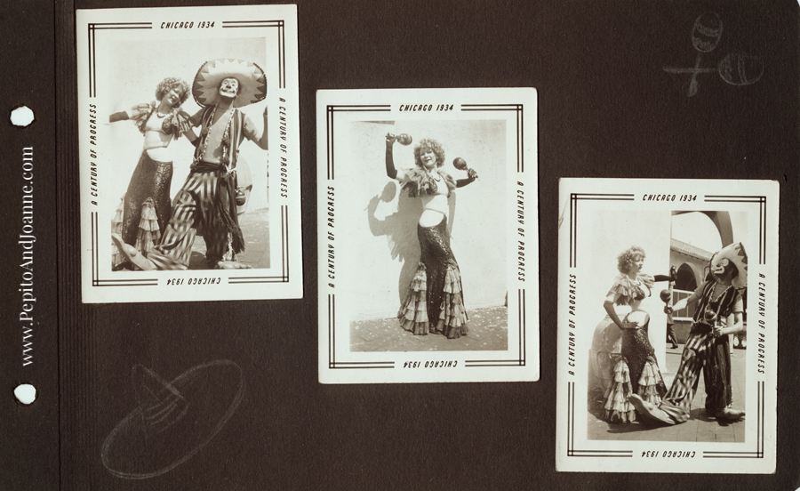 By 1933-1934, it was the deepest part of the Great Depression. Pepito and Joanne could no longer afford to pay their two assistants, Clifford Combes and Duffy. Living almost hand-to-mouth, they traveled as a pair, by train to Chicago, on the off-chance of being hired for the 1933-1934 Chicago World’s Fair, also called A Century of Progress International Exposition. Joanne wrote a letter to her mother from their Chicago hotel, saying that if they didn’t score a booking, she and Pepito had no idea what to try next. They were deeply grateful when they landed a coveted multi-week booking as sidewalk entertainers in the “Italian Village” area of the Fair.