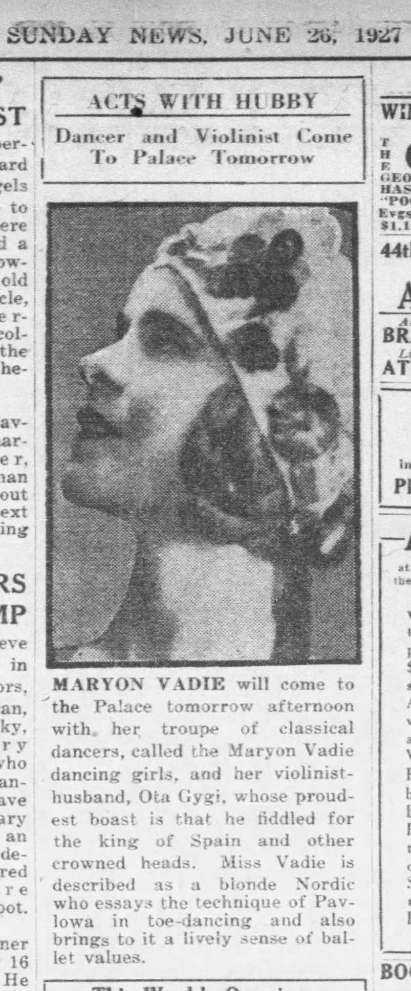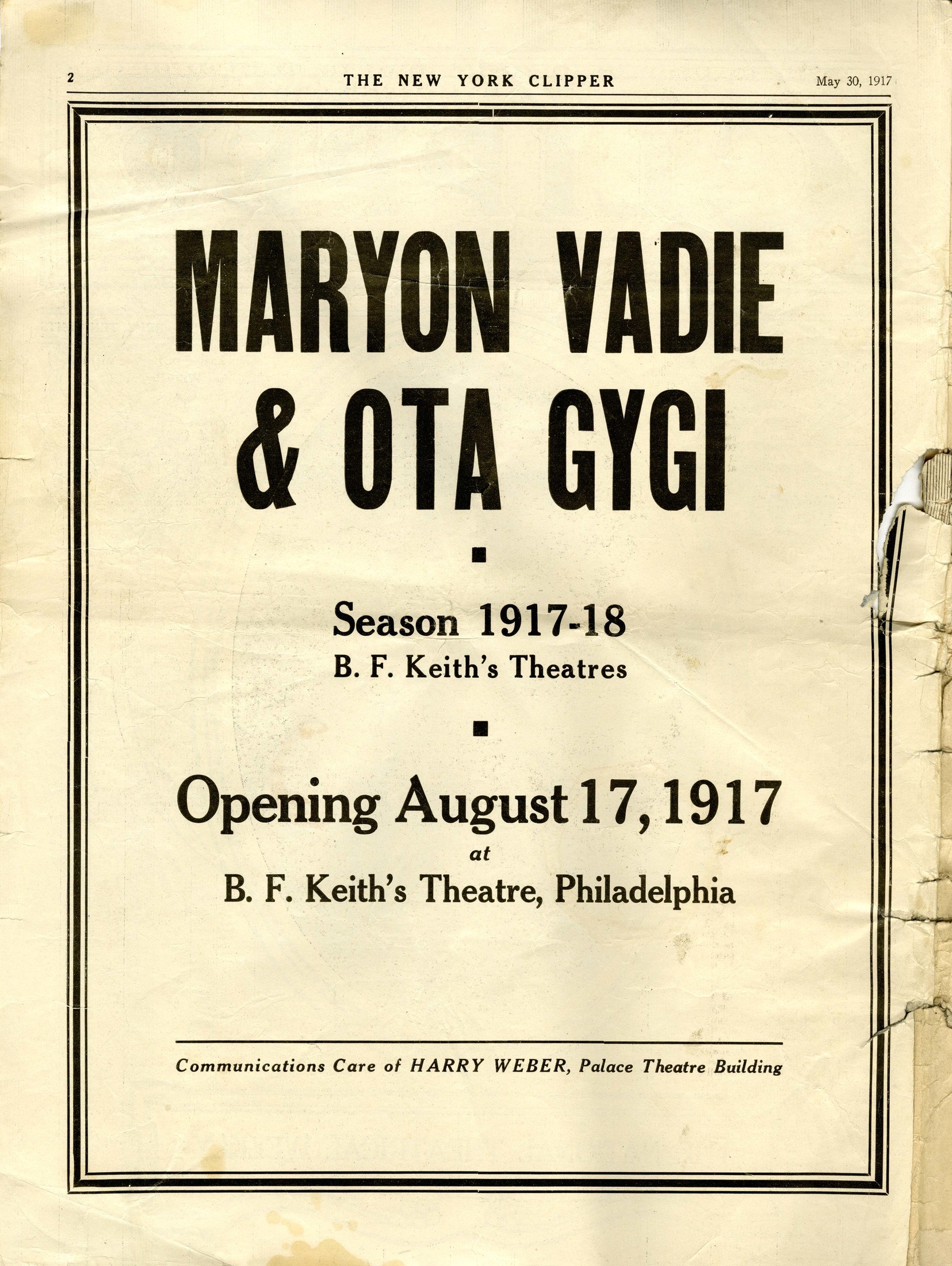 Maryon Vadie and Ota Gygi advertisement in the New York Clipper (precursor to VARIETY), 1917