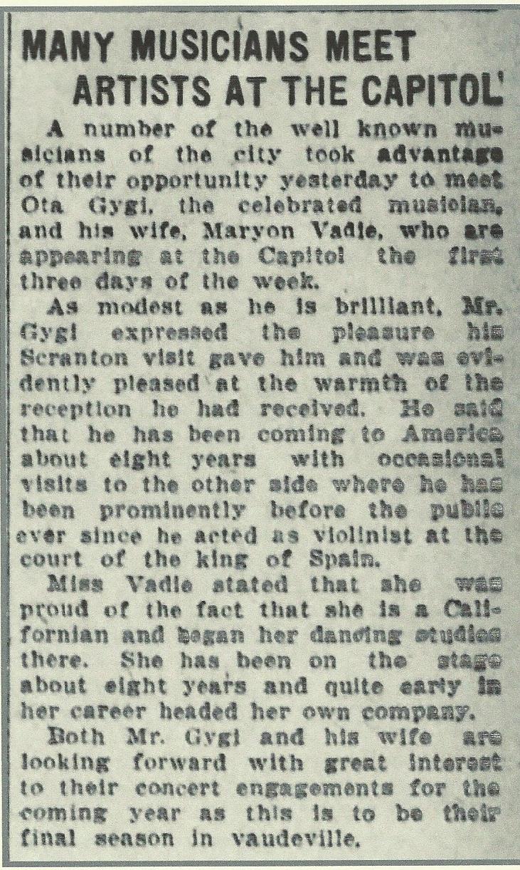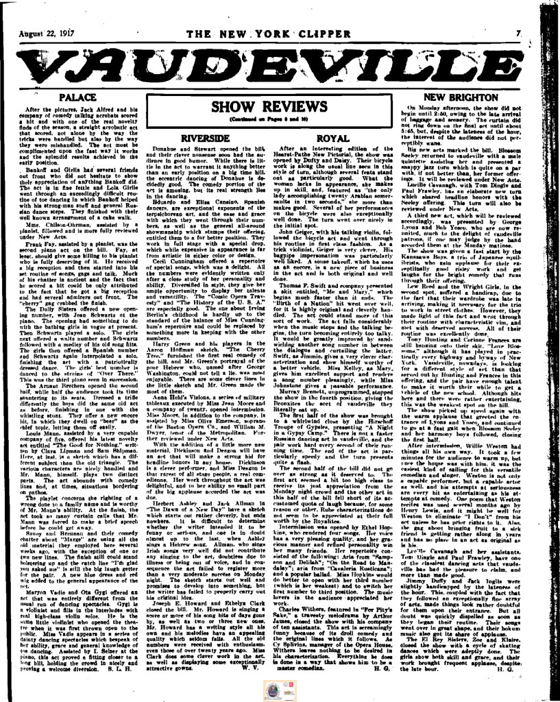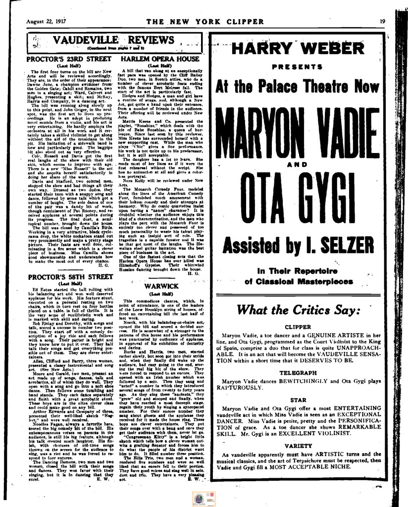 New York Clipper review of appearance at The Palace of Maryon Vadie and Ota Gygi, August 22, 1917
