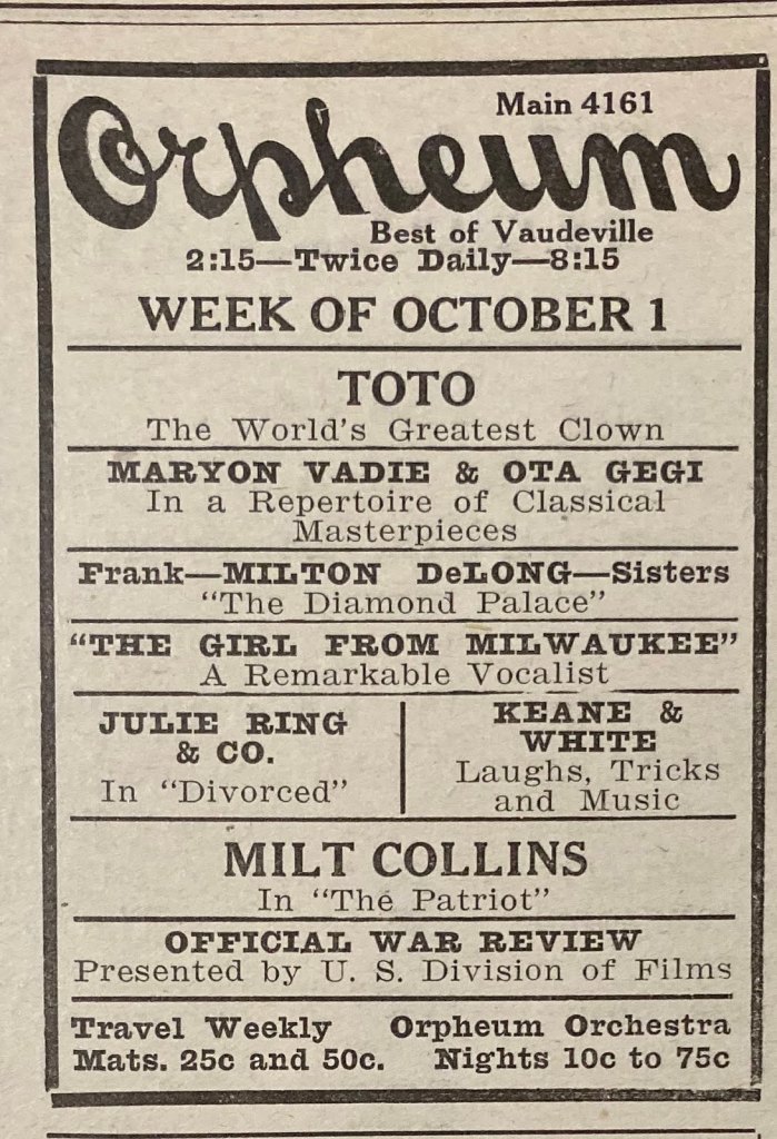 October 1, 1918 Toto, Maryon Vadie and Ota Gygi, Frank Milton, DeLong Sisters, The Girl From Milwaukee, Julie Ring & Co., Keane & White, Milt Collins. Toto (the clown) appeared with his dog, Whiskey. He would later make comedy shorts with Hal Roach. The original Toto was then replaced with Stan Laurel (Laurel and Hardy). Milt Collins was often described as imitator and one-act actor. The Girl From Milwaukee was a contralto singer. She toured the country, without revealing her true identity.