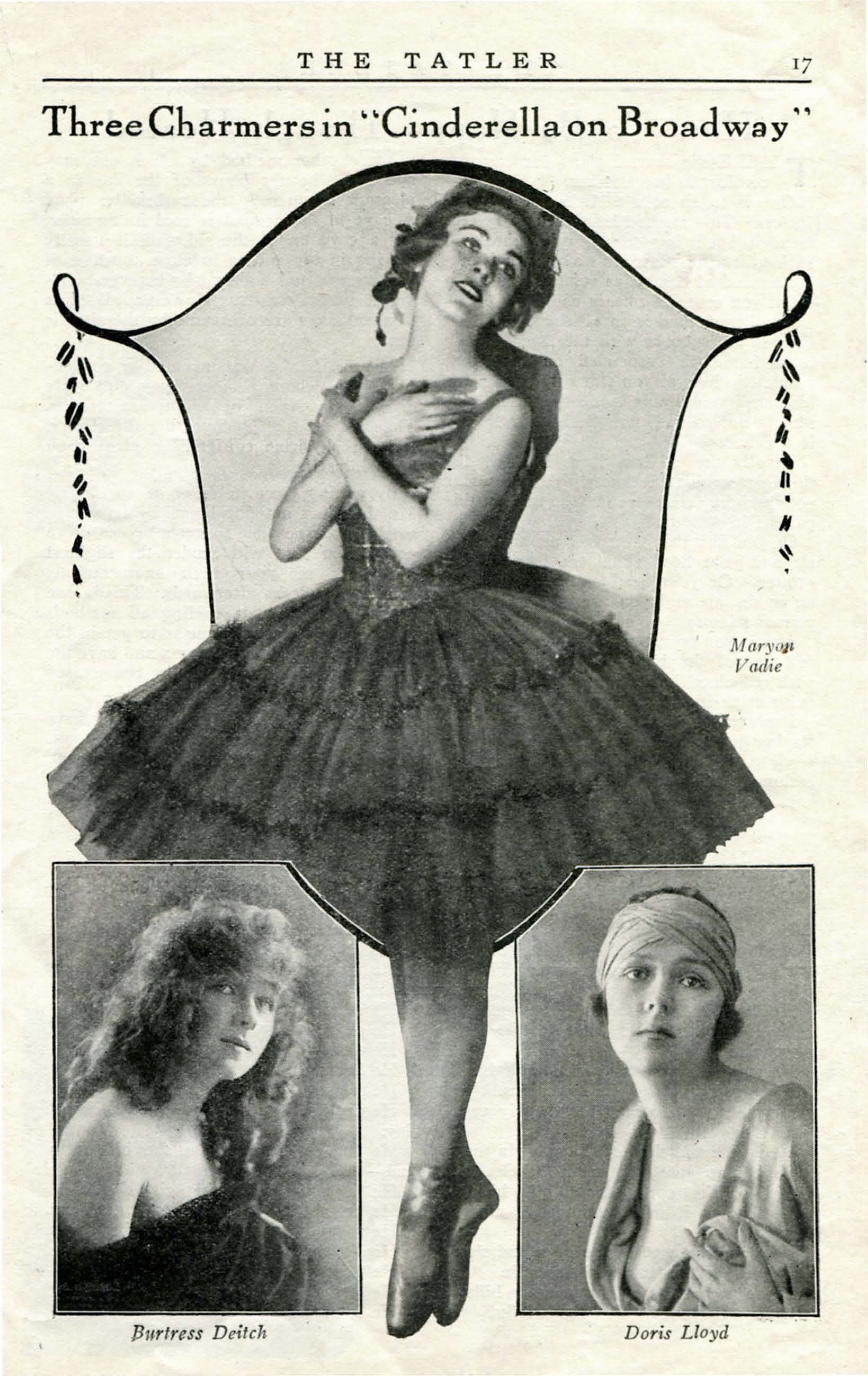 Maryon Vadie (center) in the cast of “Cinderella on Broadway,” Winter Garden Theater, New York. The TatlerMagazine, November, 1920, page 17.
