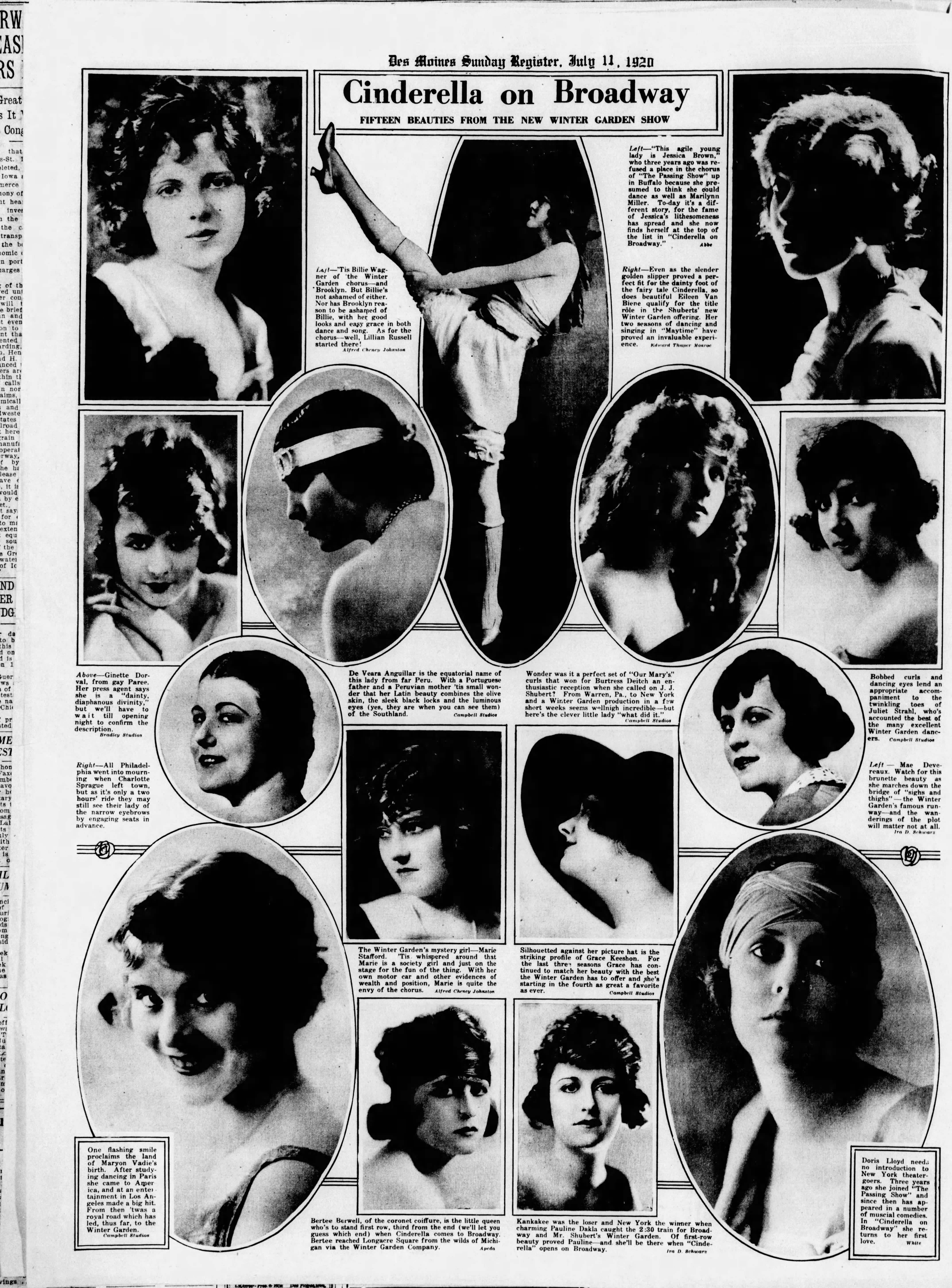 Maryon Vadie (bottom left corner) in the cast of “Cinderella on Broadway,” Winter Garden Theater, New York. Des Moines Register, July 11, 1920.