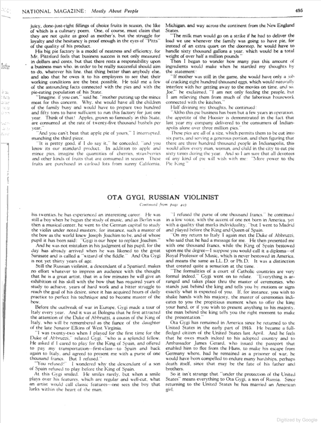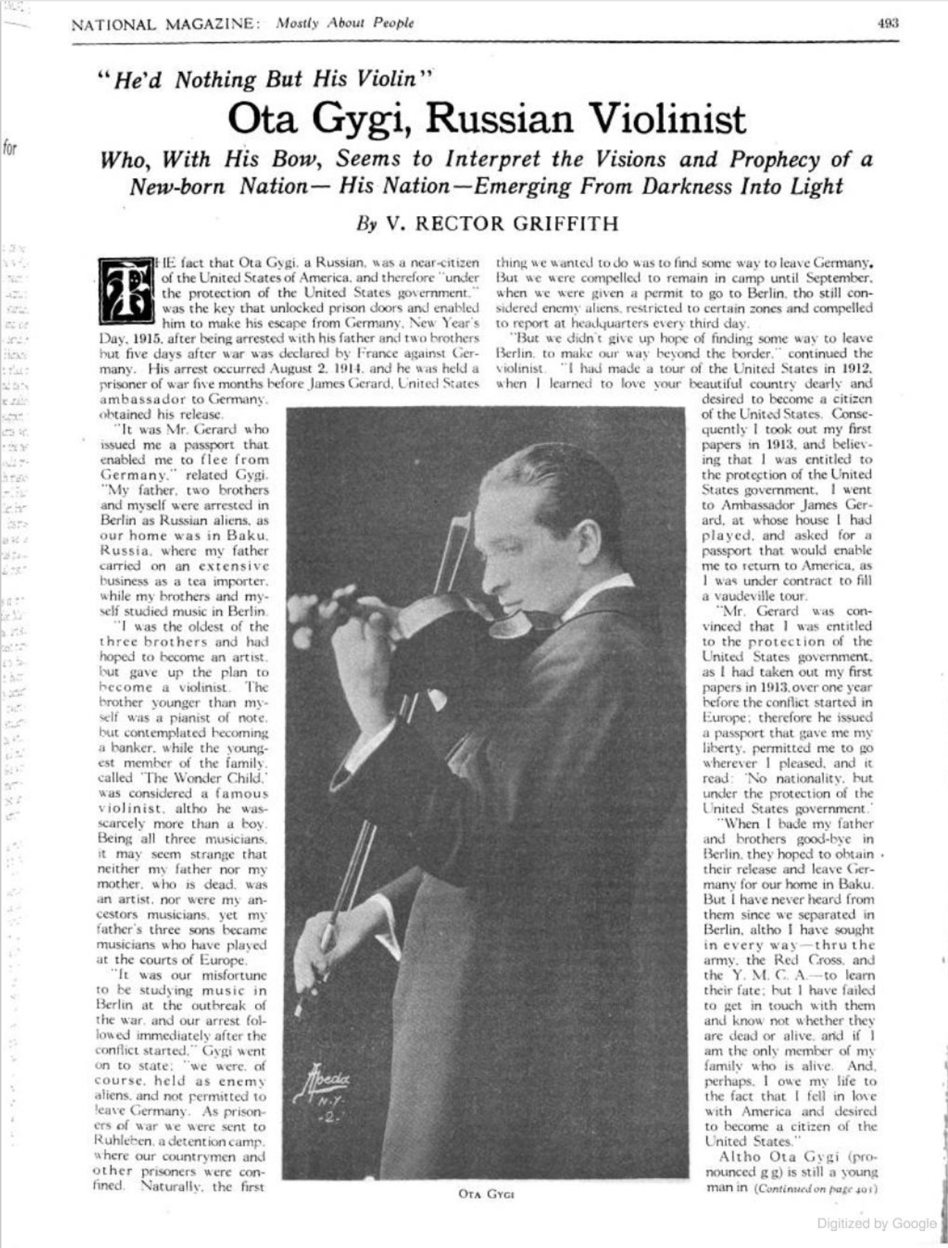 Ota Gygi, Russian violinist, profiled in National Magazine, Vol. 48, pg. 493 & 495, 1920