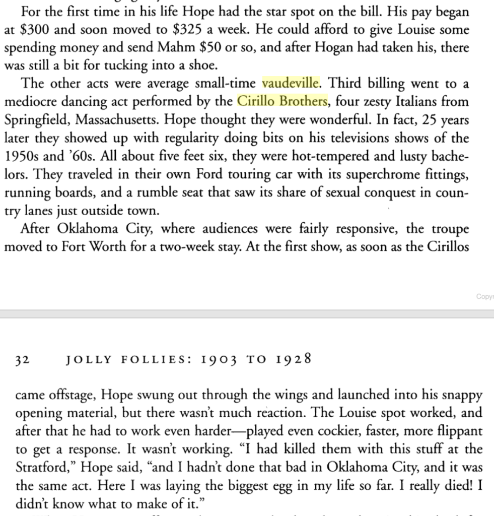 The other acts were average small-time vaudeville. Third billing went to a mediocre dancing act performed by the Cirillo Brothers, four zesty Italians from Springfield, Massachusetts. Hope thought they were wonderful. In fact, 25 years