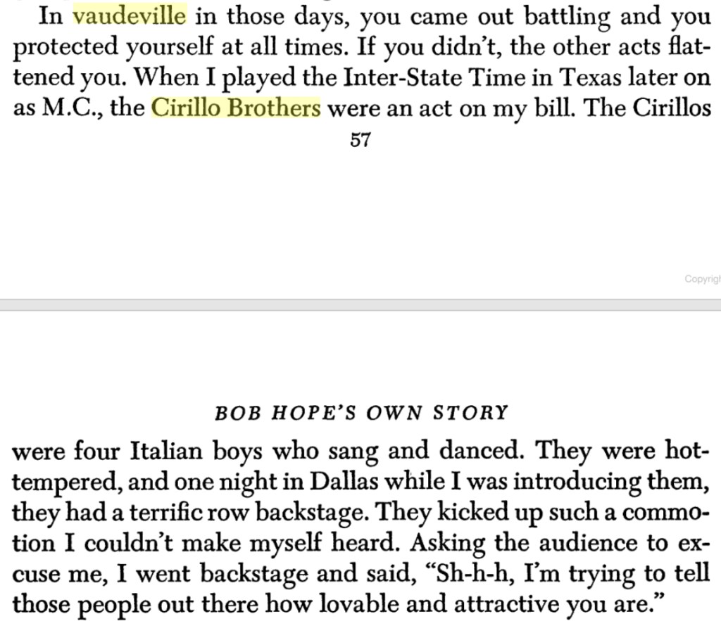 Cirillo Brothers Mentioned in Bob Hope’s Autobiography