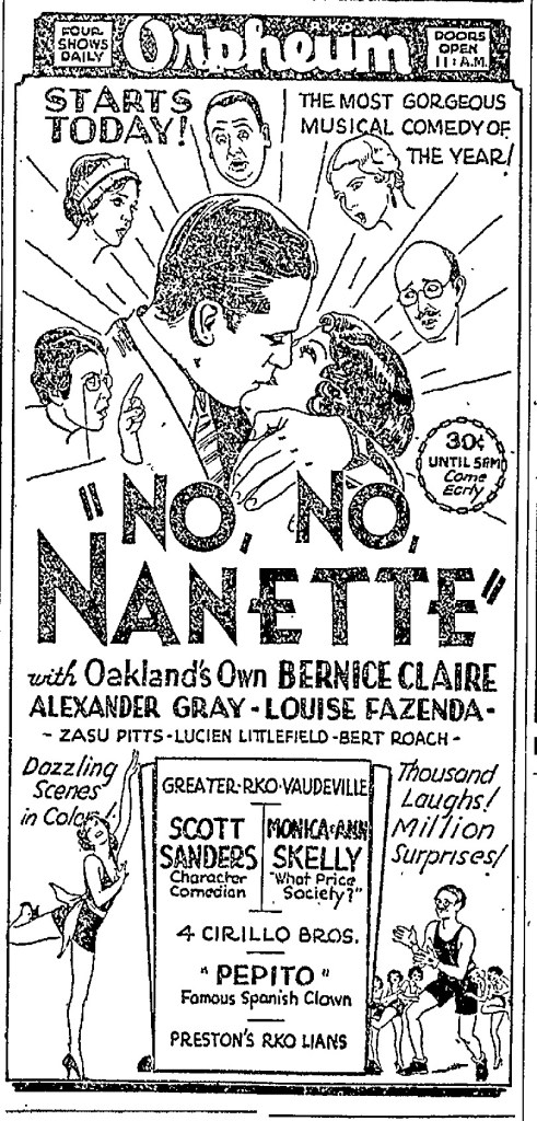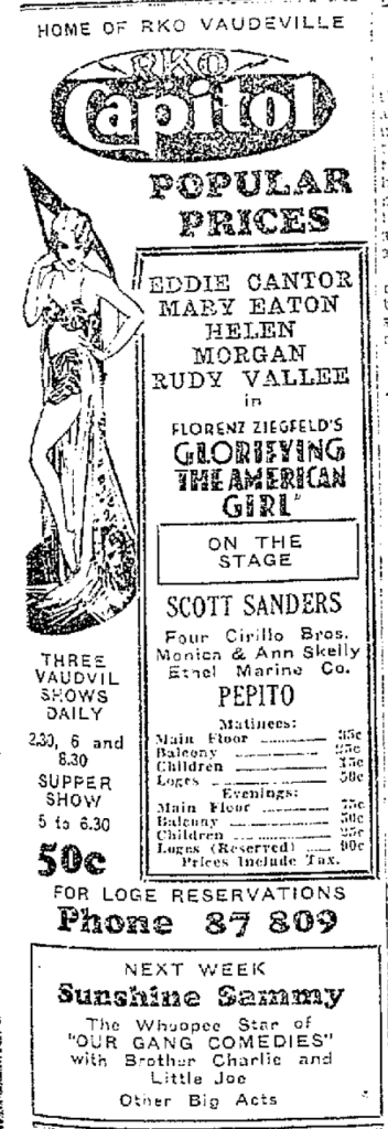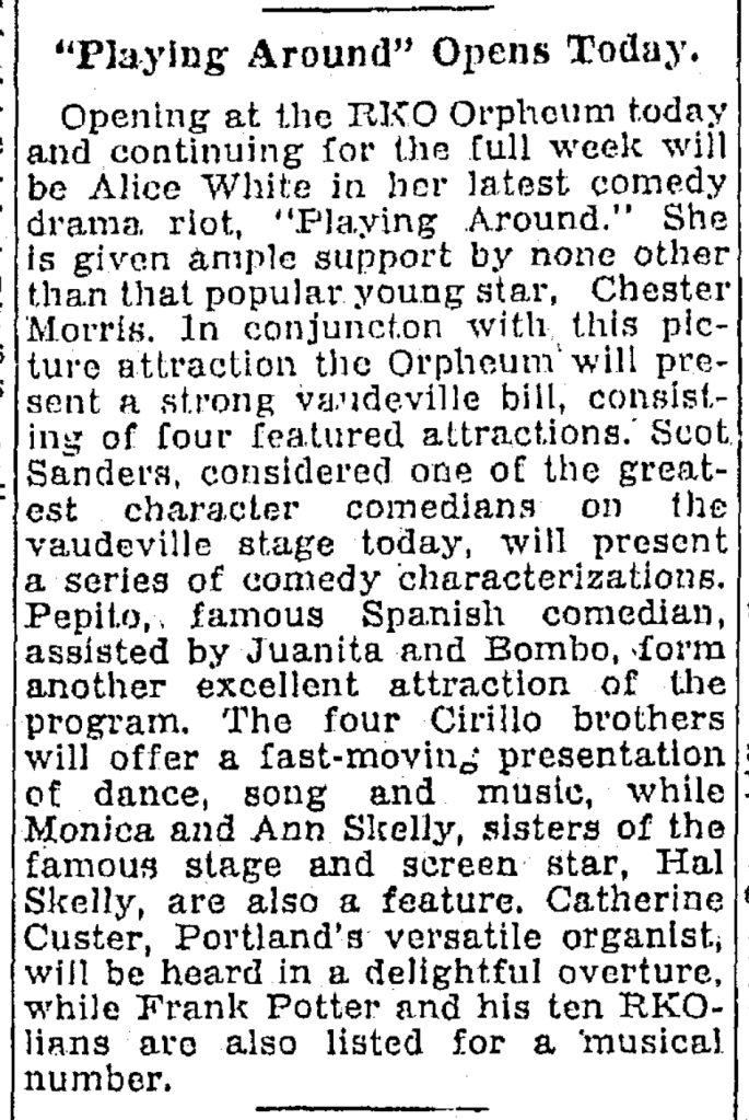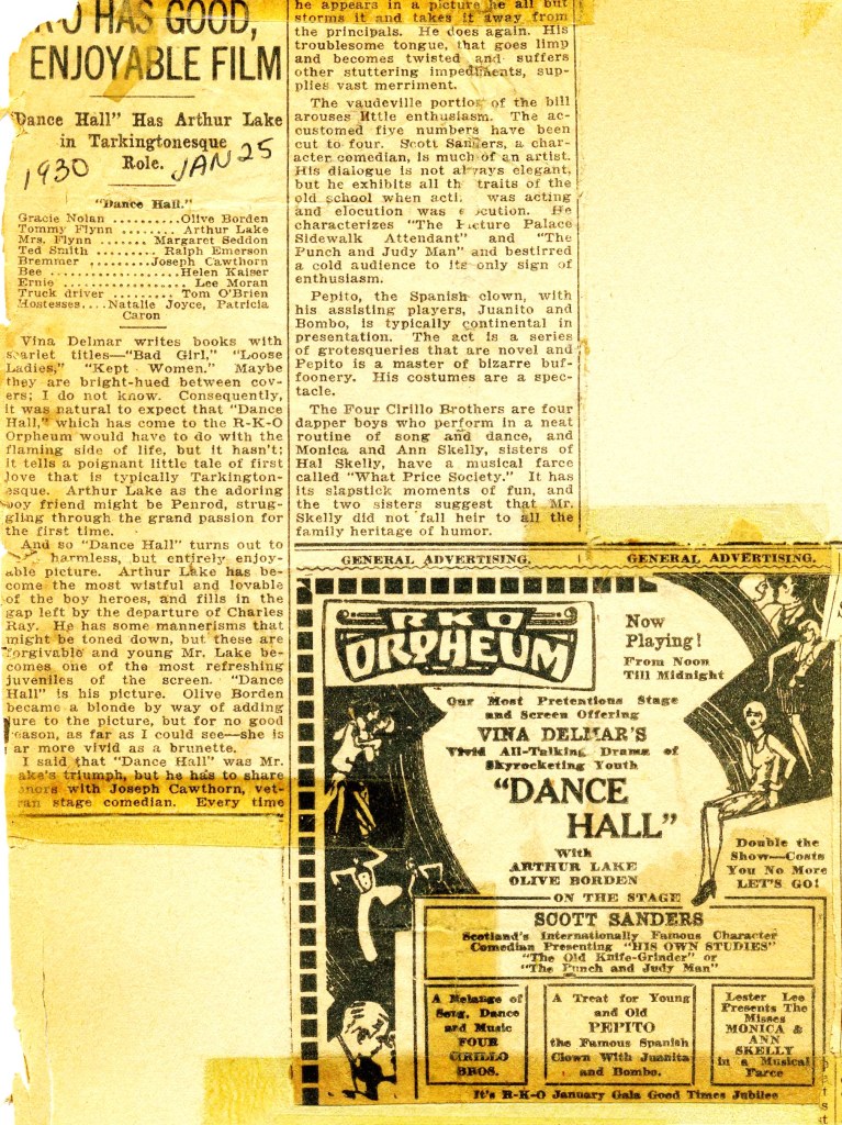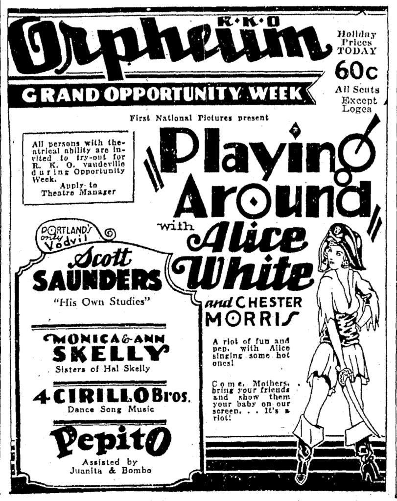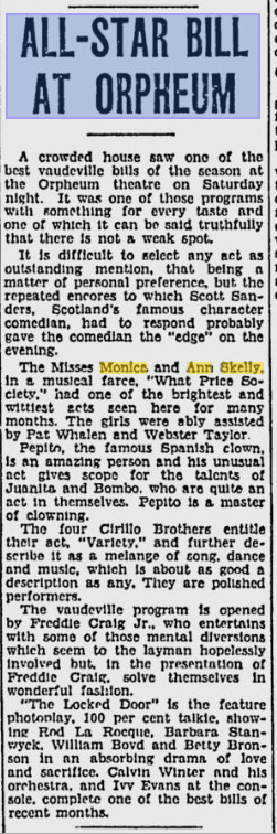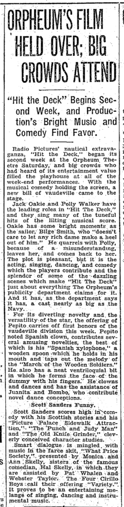 The Four Cirillos were at the top of the vaudeville profession in 1930, traveling the RKO (Radio-Keith-Orpheum) vaudeville circuit eastern loop, with stops in major cities in the United States and Canada. That year they shared a “boffo bill” loaded with top talent, including Pepito the Spanish Clown, Juanita (Joanne), and an unidentified young man with the stage name “Bombo”; Scott Sanders, “Scotland’s internationally famous character comedian”; and Monica and Ann Skelly, sisters of Hal Skelly, who performed a musical farce titled “What Price Society.”