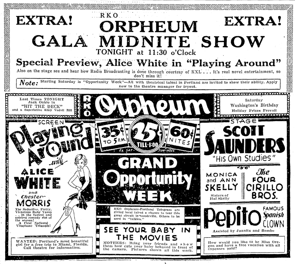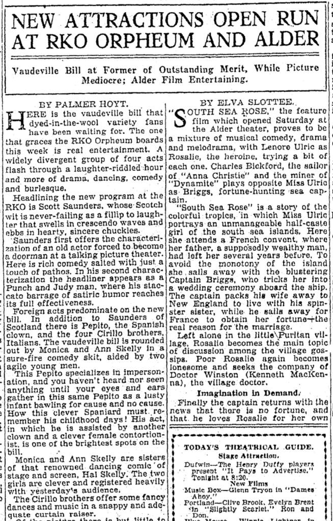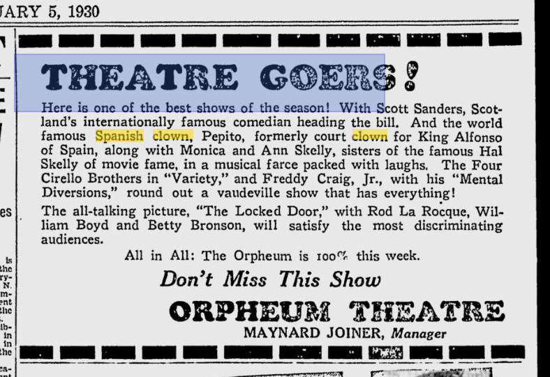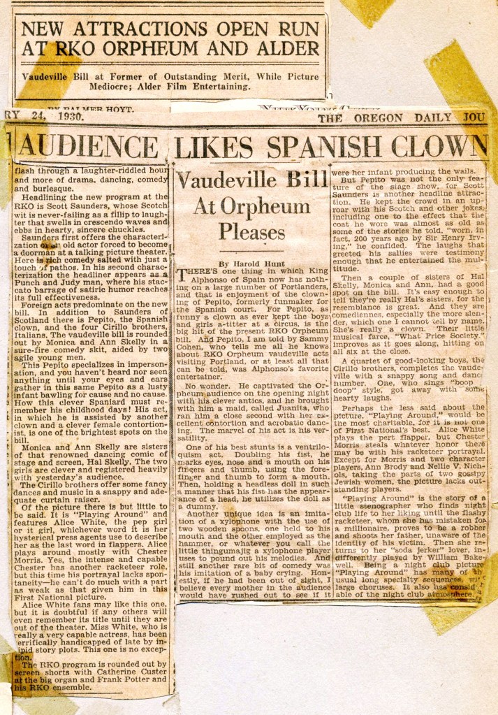 “Pepito, the famous Spanish clown, is an amazing person and his unusual act gives scope for the talents of Juanita and Bombo, who are quite an act in themselves. Pepito is a master of clowning. The Four Cirillo Brothers entitle their act, ‘Variety,’ and further describe it as a melange of song, dance and music, which is about as good a description as any. They are polished performers.” Source: The Vancouver Sun, February 3, 1930.