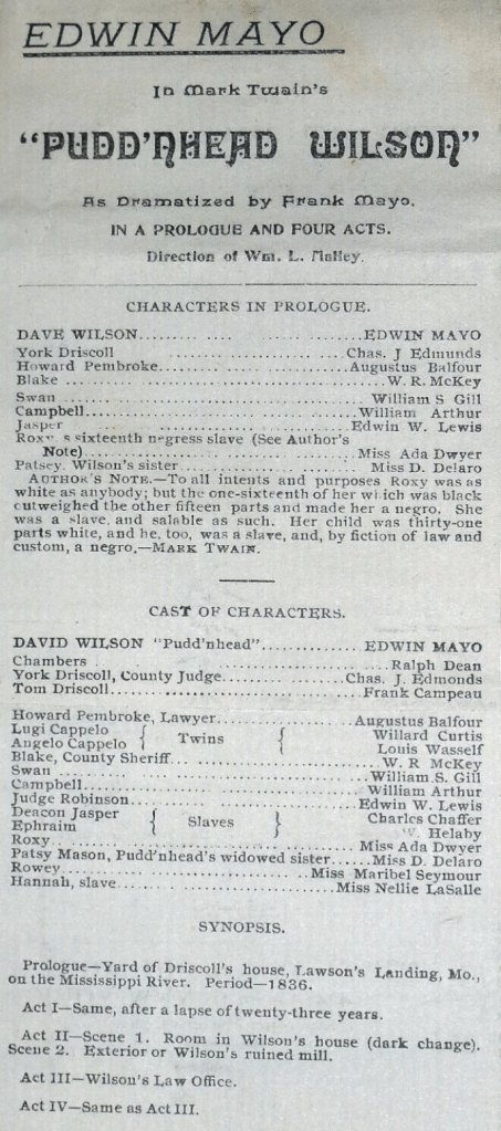 and who filled the old Mayo home with his family and guests season after season at vacation and other times — until he passed on — prematurely and “in harness,” as he died quite suddenly [in 1900] en route while playing “Pudd’nhead Wilson.”