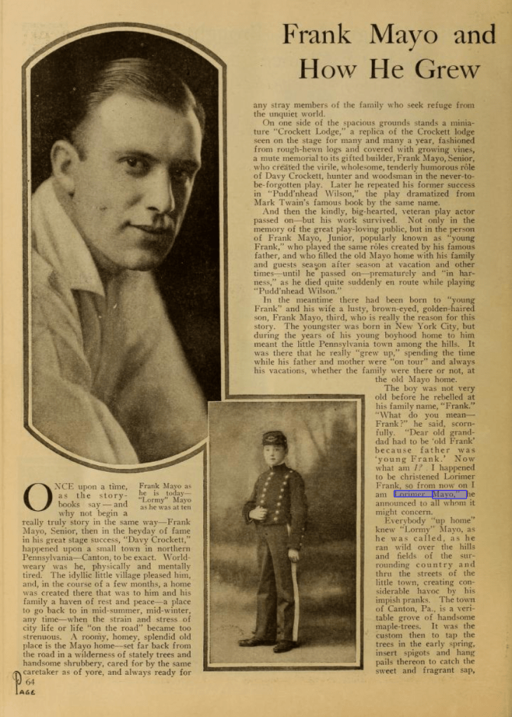 In the meantime there had been born to “Young Frank” [Edwin Forrest Mayo] and his wife [Frances Johnstone Mayo], a lusty, brown-eyed, golden-haired son, Frank Mayo, third, who is really the reason for this story. The youngster was born in New York City, but during the years of his young boyhood home to him meant the little Pennsylvania town among the hills. It was there that he really “grew up,” spending the time while his father and mother were “on tour” and always his vacations, whether the family were there or not, at the old Mayo home.